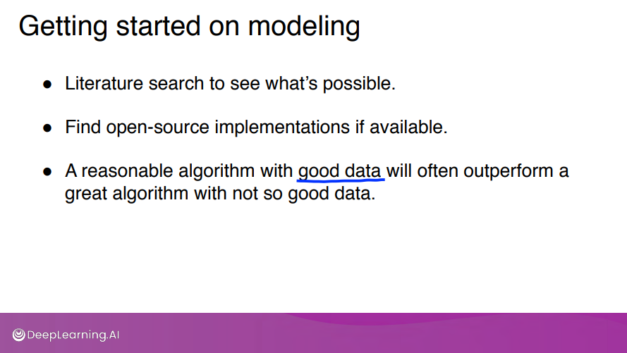 많은 연구는 데이터 세트를 다운로드하고 데이터 세트에서 잘 작동하는 전체 모델을 찾으려고 노력하는 연구원들에 의해 성장했다. 그러나 많은 애플리케이션의 경우 데이터가 마음에 들지 않으면 데이터를 변경할 수 있는 유연성이 있다. 따라서 알고리즘이나 모델이 기본적으로 해결된 문제인 프로젝트가 많이 있다.