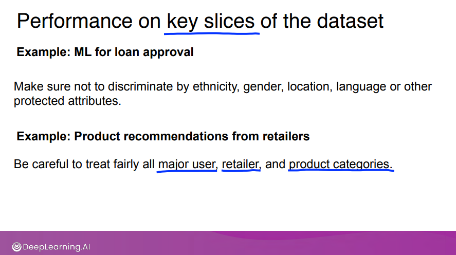 첫째, 기계 학습 시스템은 평균 테스트 세트 오류가 낮을 수 있지만 불균형적으로 중요한 예제 세트에 대한 성능이 충분하지 않은 경우 기계 학습 시스템은 여전히 프로덕션 배포에 적합하지 않다.