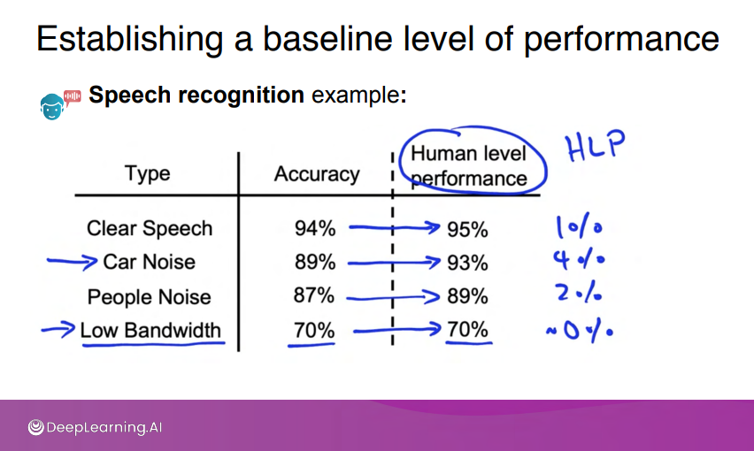 이전에 인간 수준의 성능이 없다고 말했지만 낮은 대역폭 오디오 작업이 가장 유망하다고 생각했을 수 있다. 이 분석을 통해 낮은 대역폭 오디오가 왜곡되었을 수 있음을 깨달았다. 심지어 사람, 인간은 무슨 말을 했는지 알아차리지 못하며, 그것에 노력하는 것이 그다지 유익하지 않을 수 있다. 대신 자동차 소음을 배경으로 음성 인식을 개선하는 데 관심을 집중하는 것이 더 유익할 수 있다.