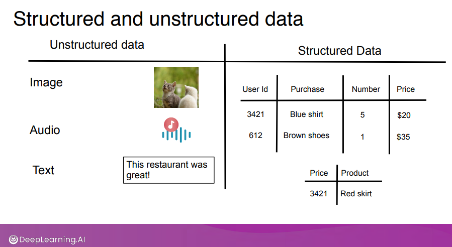 비정형 데이터는 고양이 사진과 같은 이미지, 음성 인식 예제와 같은 오디오 또는 레스토랑 리뷰의 텍스트와 같은 자연어와 같은 데이터 세트를 나타낸다. 비정형 데이터는 인간이 해석을 매우 잘하는 데이터인 경향이 있다.