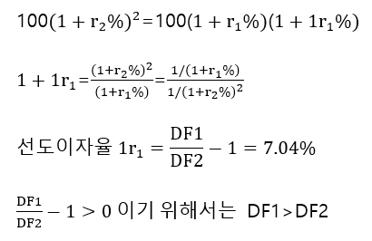 Ex2) 현재 시점에 2년 만기 국채의 수익률이 5%, 1년 만기 국채의 수익률이 3%라고 한다면, 1년후 시점에서 1년 만기 국채의 연 수익률은 얼마인지에 대한 예상
