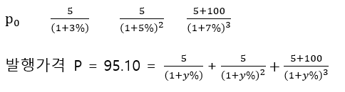 Ex1) 동일한 발행인의 1년 만기, 2년 만기, 3년 만기 할인채의 수익률이 각각 3%, 5% 7%일 때 액면가 100만원, 표면이자율 연 5%인 3년 만기 이표채의 발행각격 P와 수익률 y