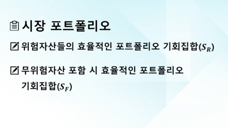 - 위험자산들의 효율적인 포트폴리오 기회집합(S_R) 이자 무위험자산 포함 시 효율적인 포트폴리오 기회집합(S_F)