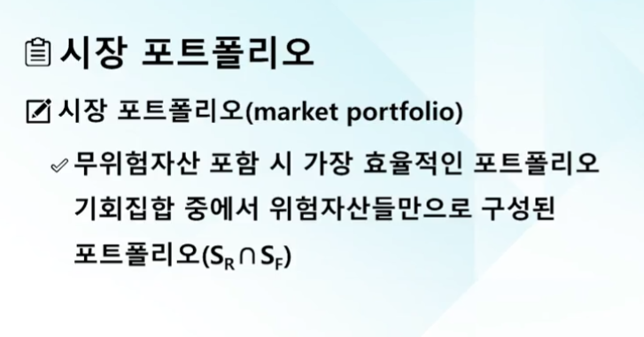 - 시장 포트폴리오는 가장 효율적인 포트폴리오 기회집합에 속함