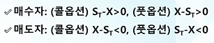 - 매수자: (콜옵션) St-X>0, (풋옵션) X-St>0