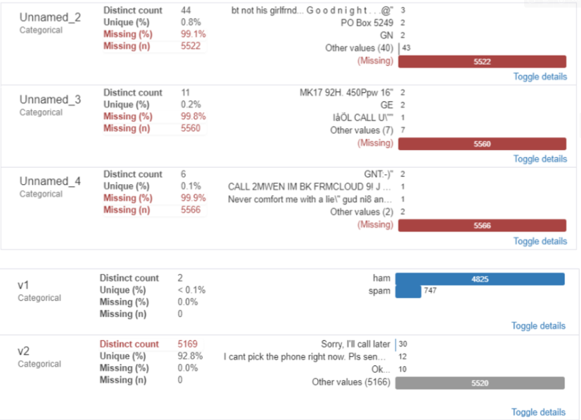 - 데이터에 존재하는 모든 특성 변수들에 대한 결측값, Unique Values의 개수 등의 통계치를 보여줌