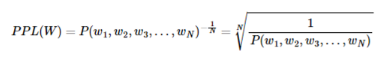 - 문장 W의 길이가 N이라고 하였을 때의 PPL은 다음과 같음