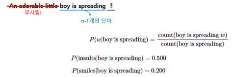 - 이 경우, spreading 다음에 올 단어를 예측하는 것은 n-1에 해당되는 앞의 3개의 단어만을 고려