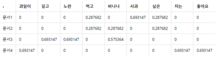- TF-IDF는 모든 문서에서 자주 등장하는 단어는 중요도가 낮다고 판단하며, 특정 문서에서만 자주 등장하는 단어는 중요도가 높다고 판단됨