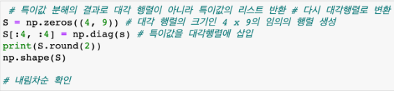 - SVD로 나온 내각행렬의 대각 원소의 값을 행렬 A의 특이값