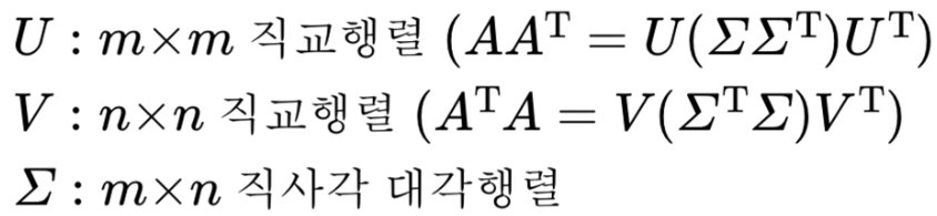 - A = m x n 행렬 → 3개의 행렬의 곱으로 분해