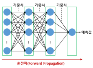 - 입력값 → 입력층, 은닉층 지나며 각 층에서의 가중치로 연산돼 출력층으로 향해 → 예측값 추출.