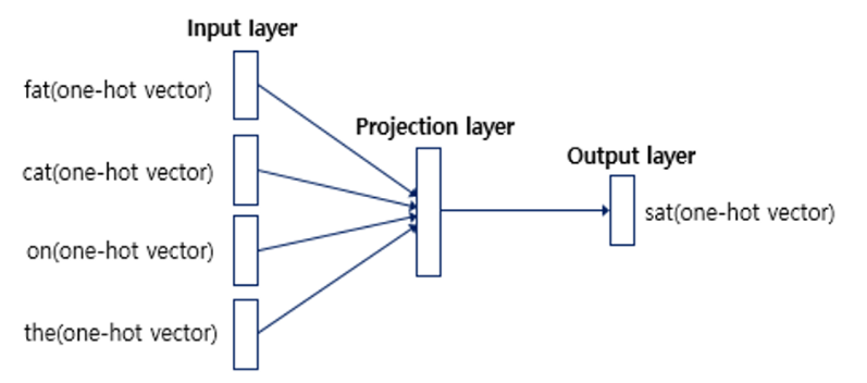 - CBOW는 주변에 있는 단어들을 입력으로 중간에 있는 단어들을 예측하는 방법