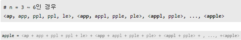 최소값 = 3, 최대값 = 6인 경우라면, 단어 apple에 대해서 FastText는 아래 내부 단어들을 벡터화