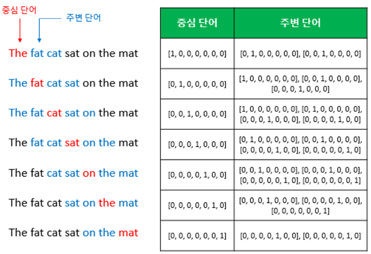 - Skip-Gram은 중간에 있는 단어들을 입력으로 주변 단어들을 예측하는 방법
