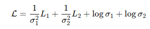 multi-task setting에서 전체 loss가 L1,L2L_1, L_2 두 항으로 나뉜다고 하면, 다음처럼 각 task의 “불확실성 σi\sigma_i”를 학습 가능한 파라미터로 두고,