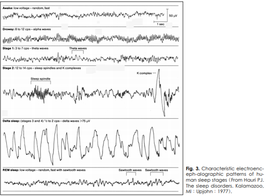 각성 단계에서 Calpa(8-13Hz), beta파(13-35Hz), 전체 수면의 5%이하를 차지하고 안구운동의 수의적 조절이 가능하다.