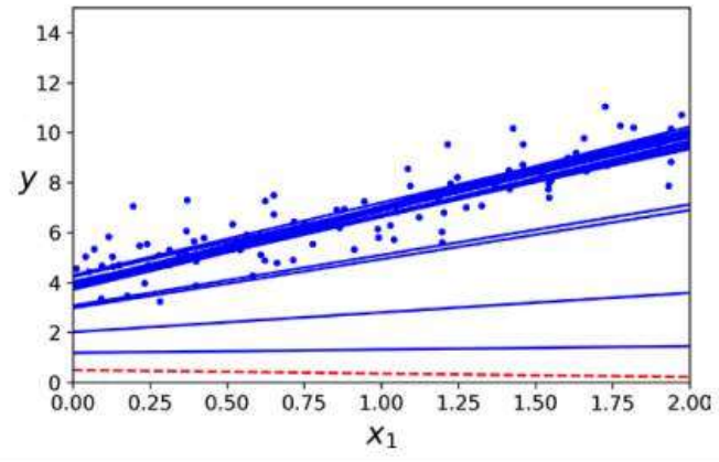 각 스텝에서 전체 훈련 세트나 하나의 샘플을 기반으로 그레이디언트를 계산하는 것이 아니라 미니배치라고 부르는 임의의 작은 샘플 세트에 대해 그레이디언트를 계산한다.