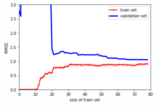 - 검증 세트 : validation set은 모델이 적은 수의 훈련데이터로 제대로 일반화하지 못하여 rmse가 2.5부터 시작하여 점점 감소하여 훈련 세트의 그래프와 가까워진다.