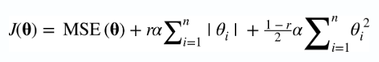 규제항은 릿지와 회귀의 규제항을 단순히 더해서 사용하며, 두 규제항의 혼합정도를 혼합비율 r을 사용해 조절한다.