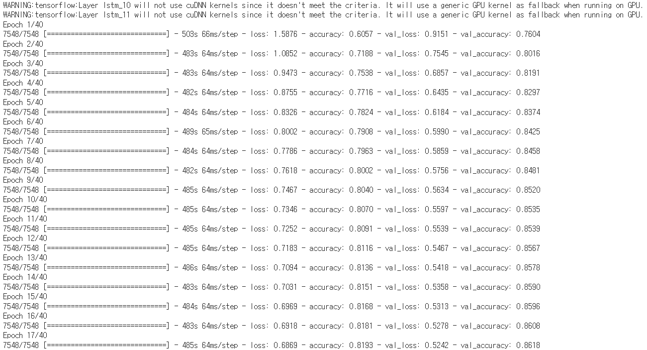 Embedding 시킨 모델에 Conv1D를 2곂 쌓고, LSTM을 2곂 쌓아 모델을 구축 후, Flatten으로 1차원으로 만들어준다.