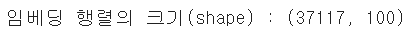 print('임베딩 행렬의 크기(shape) :',np.shape(embedding_matrix))