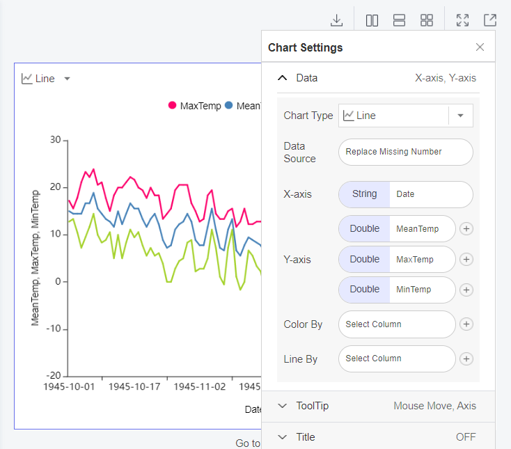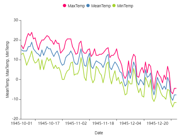 저는 Line으로 x축은 Date, Y축은 Max/Mean/Min Temp로 설정하고 봤습니다.