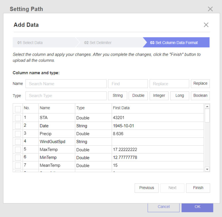 데이터의 Name과 Type, First Data를 확인하며 오류가 있는지 확인해주는 작업입니다.