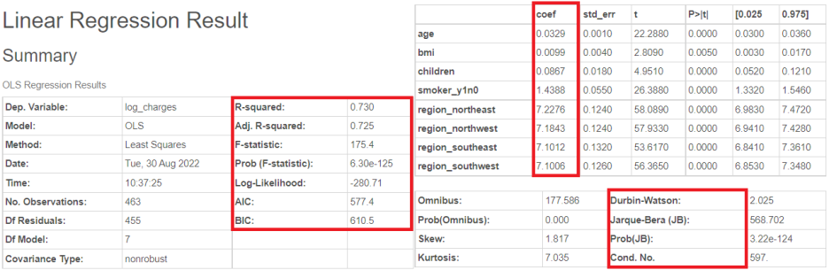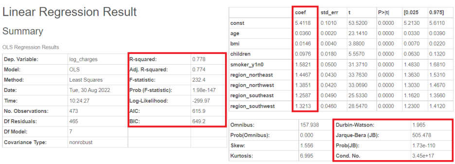 저기 R-squared나 AIC 등도 보이고 아래 보시면 저번 포스팅에 다뤘던 쟈크베라 검정도 보이네요!
