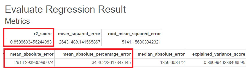 R-sqaure는 0.86, MAE는 2914, MAPE는 34이 나온 것을 볼 수 있습니다.
