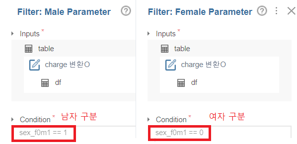Filter(남/여 분류) -> Select Column(성별 제외)