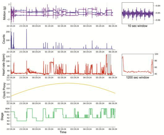 수면을 측정하는 웨어러블, 다중 센서, 장치 등은 일반화되었지만 이러한 장치에서 수면점수를 매기는데 사용하는 알고리즘은 오픈 소스가 아니고 위부 사용에 엑세스하기 쉽지 않다. 결과적으로 임상 및 연구 응용 분야에서 유용성이 제한된다. 이 논문에서는 수면다원검사를 받는 참가자와 검사 이전 보행 기간 동안 착용한 Apple Watch에서 원시 가속도 데이터와 심박수를 수집했다. 이 데이터를 사용하여 여러 분류기의 성능에 대한 여러 기능의 기여도를 비교했다. 이 연구는 수면 및 수면 단계 예측의 정확도 개선을 위해 가속도 및 심박수 데이터를 분석했다. 여기서는 MESA(Multi-ethnic Study of Atherosclerosis)의 데이터를 사용하여 Apple Watch 데이터에서 훈련된 모델을 테스트하여 결과를 일반화 했으며 수면을 예측할 수 있음을 발견했다.