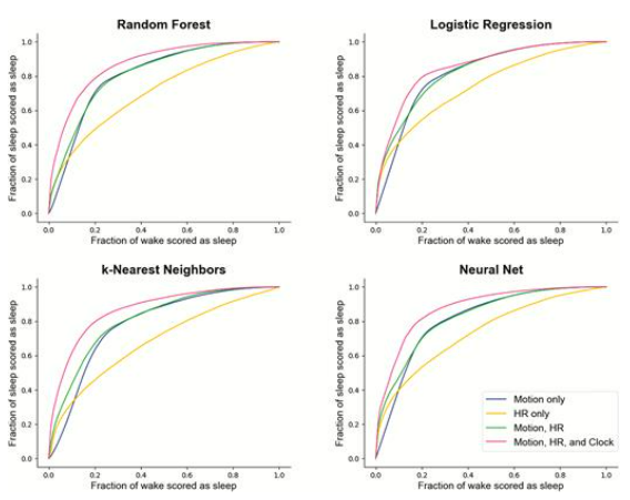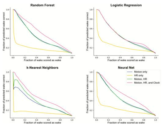 로지스틱 회귀, k-최근접 이웃, 랜덤 포레스트 분류기 및 신경망(다층 퍼셉트론, MLP)이 서로 다른 분류 알고리즘을 비교할 때 후보 모델로 사용된다.이 문서에서 분석을 수행하고 수치를 생성하는 데 사용된 모든 코드는 https://github.com/ojwalch/sleep_classifiers 에서 사용할 수 있다. 각 분류기에 대해 검색된 하이퍼파라미터는 보충 표 S1에 제공된다.